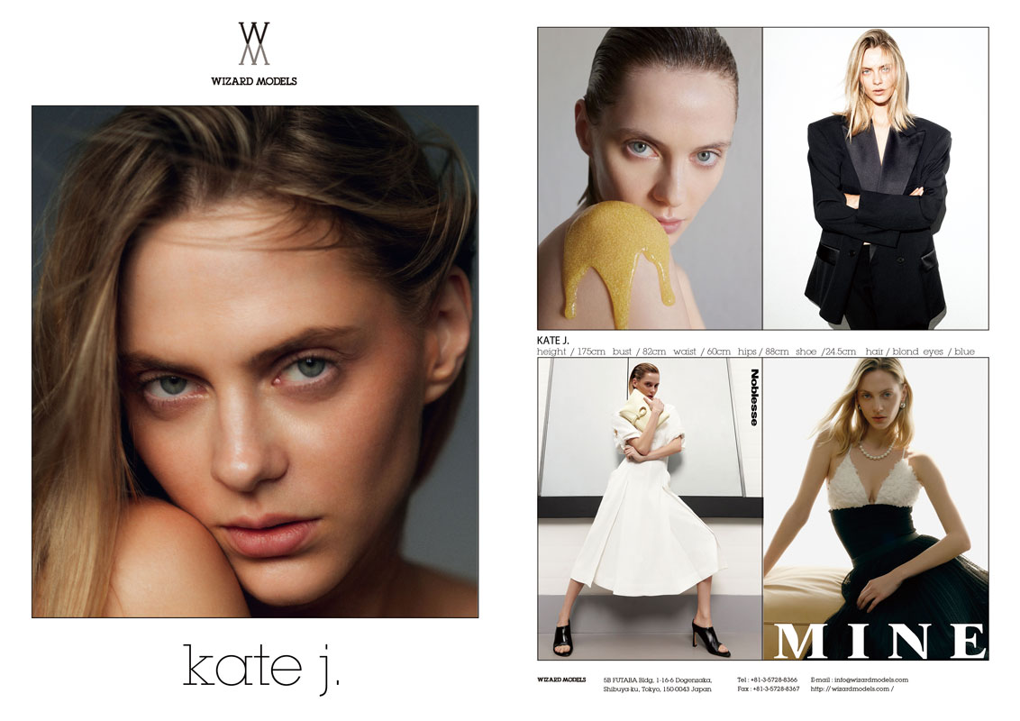 Kate J. height: 175cm bust: 82cm waist: 60cm hips: 88cm shoes: 24.5cm hair: Blond eyes: Blue COMPOSITE